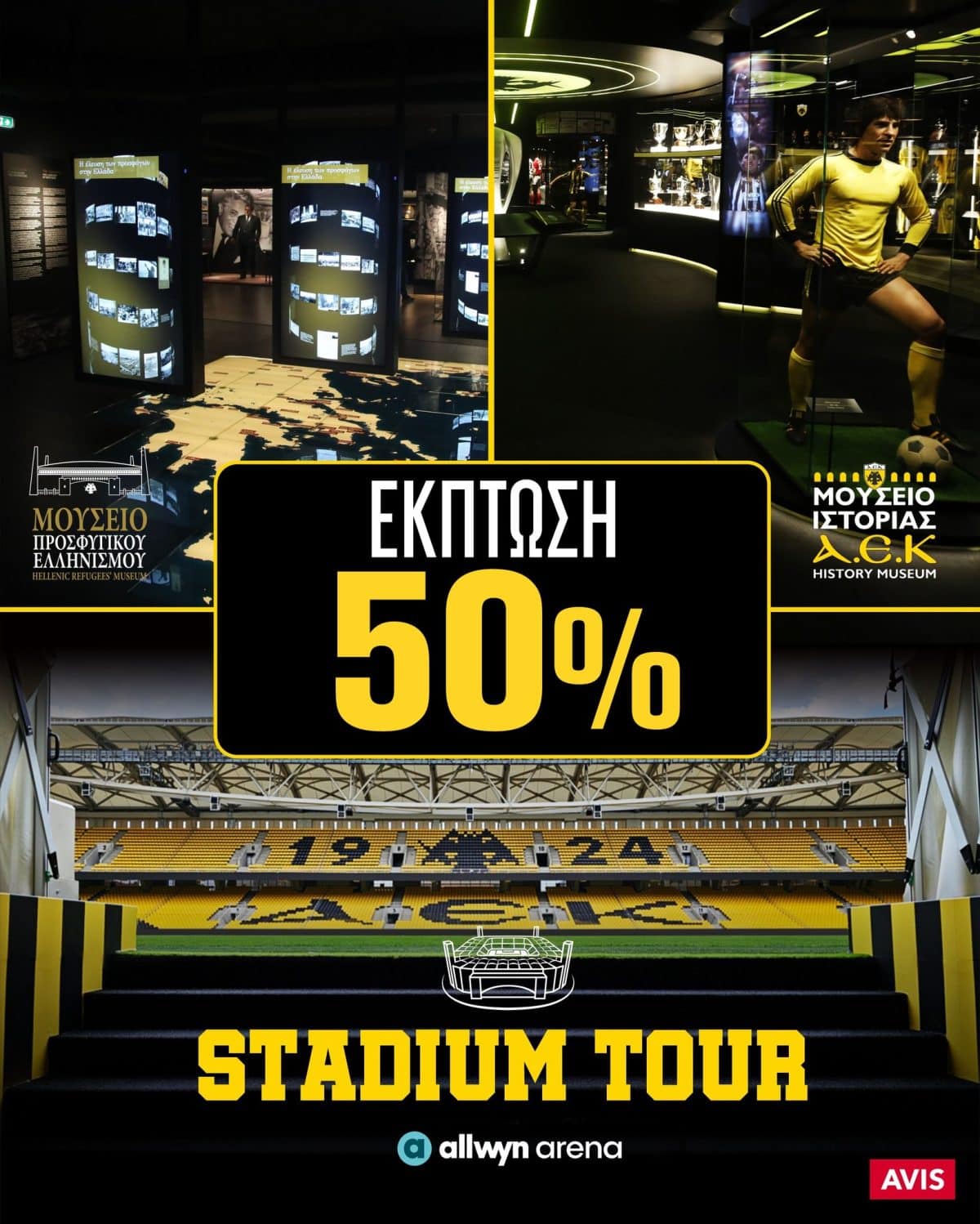 Η ΑΕΚ ανακοίνωσε ότι κατά τη διάρκεια της Μεγάλης Εβδομάδας οι φίλοι της ομάδας θα μπορούν να επισκεφθούν τα Μουσεία με 50% έκπτωση στα κανονικά εισιτήρια. Η προσφορά ισχύει από τη Μεγάλη Τρίτη 7 Απριλίου έως και την Κυριακή 19 Απριλίου 2026, περιλαμβάνοντας και τις ξεναγήσεις στο γήπεδο.