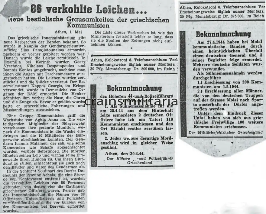 Οι άλλες φωτογραφίες-ντοκουμέντα που περιμένουν να δουν το φως προέρχονται από σφαγές σε Αγρίνιο, Φλώρινα, Δίστομο και Λήμνο. Υπάρχουν επίσης δεκάδες φωτογραφίες από τη γερμανική επέλαση στην Κρήτη και από τη σφαγή του Βιάννου – και όχι μόνο. Υπάρχουν ντοκουμέντα από τις σφαγές στο Κοντομαρί, στα Κερδύλια, στο Δομένικο της Λάρισας (από Ιταλούς μελανοχίτωνες), στην Κλεισούρα, στην Κεφαλονιά, στην Κατράνιτσα, στη Θεσσαλονίκη, στη Θεσσαλία, σε όλη την Ελλάδα ολοκαυτώματα.
