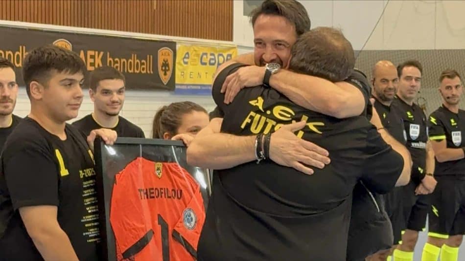 Πριν την έναρξη του αγώνα της ανδρικής ομάδας futsal με τον Δούκα η ΑΕΚ βράβευσε τον κορυφαίο τερματοφύλακα, Δημήτρη Θεοφίλου για την πολυετή προσφορά του στο τμήμα. Συγκινητική ήταν η στιγμή όταν όλοι οι αθλητές φόρεσαν τη φανέλα με τον αριθμό του αλλά και τους τίτλους που έχει κατακτήσει με την ΑΕΚ ενώ δέχτηκε και το θερμό χειροκρότημα των φίλων της ομάδας που βρέθηκαν στο «Γ. Κασιμάτης».