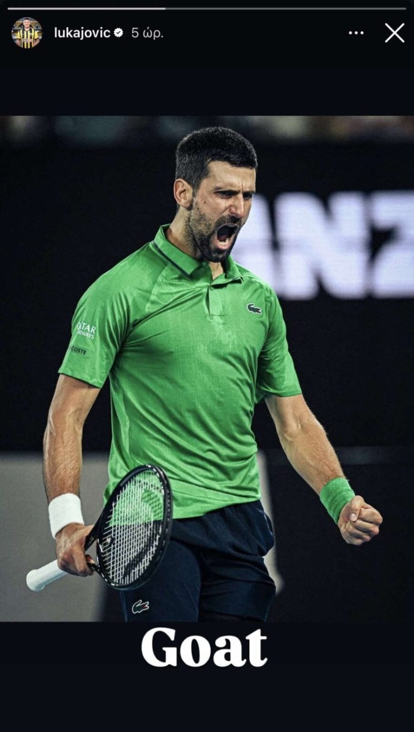 Ο εκπληκτικός Νόβακ Τζόκοβιτς νίκησε τον Σίνερ και προκρίθηκε στον τελικό του Australian Open, με τον Λούκα Γιόβιτς να εκφράζει τον θαυμασμό του για τον συμπατριώτη του. Ο Σέρβος επιθετικός της ΑΕΚ ανέβασε στο Instagram μια πανηγυρική φωτογραφία του Τζόκοβιτς σχολιάζοντας απλά «Goat».