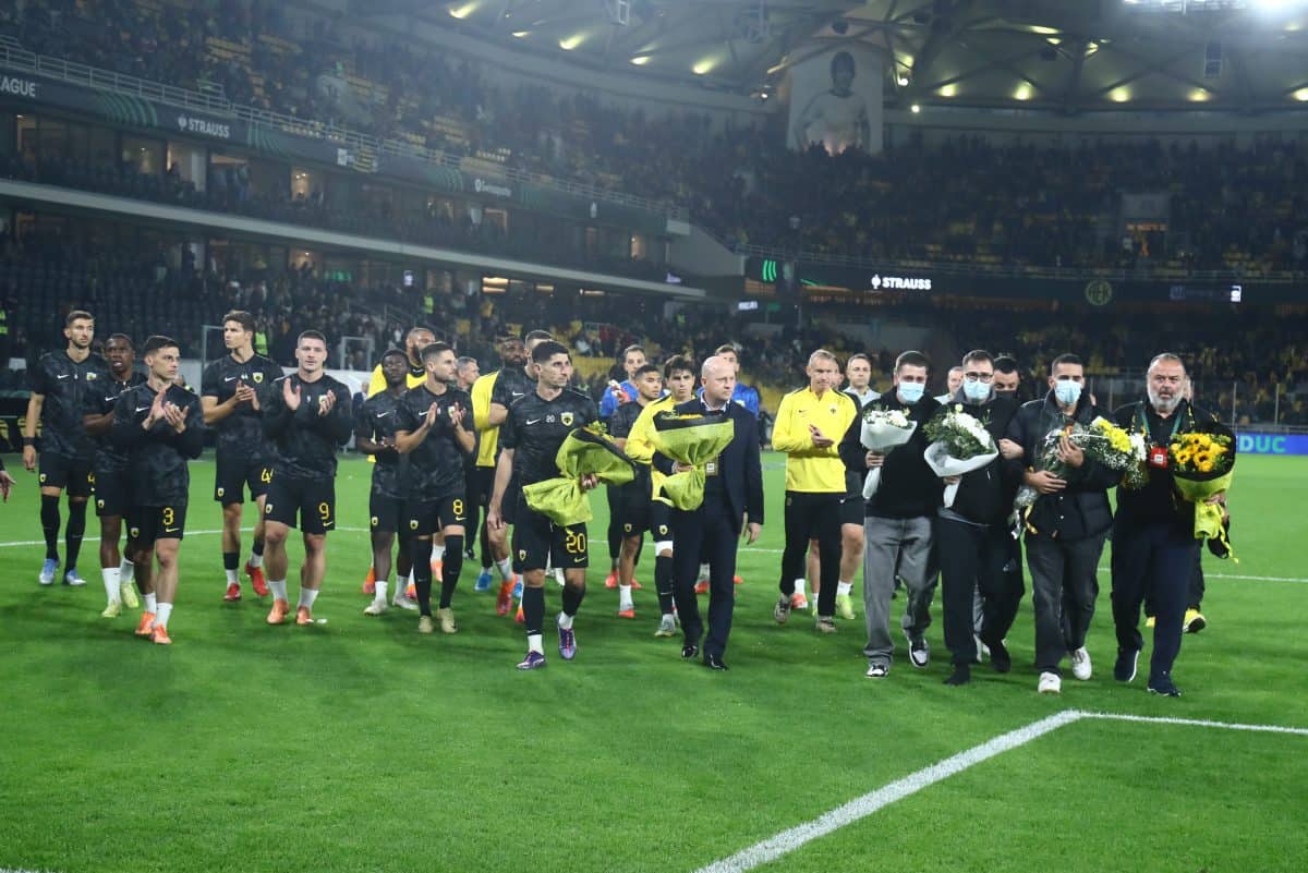 Σε ένα κλίμα συγκίνησης όλη η ομάδα του «Δικεφάλου», παρέδωσε λουλούδια μπροστά στο πέταλο των οργανωμένων φιλάθλων της ΑΕΚ, με τον κόσμο στο γήπεδο να φωνάζει συνθήματα για την μνήμη του Μάριου.