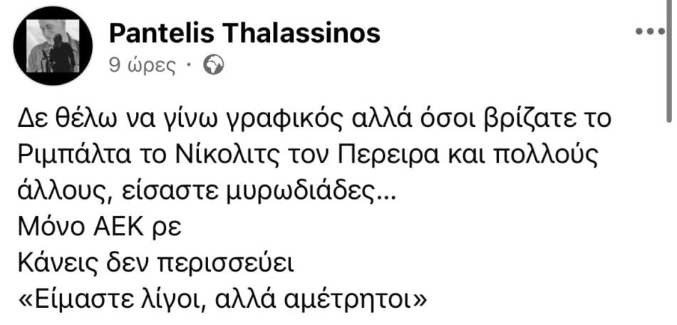 Κάτι τέτοιο έγινε και με τον Παντελή Θαλασσινό, όπου με ανάρτηση του τα έβαλε με όσους έβριζαν παλιότερα Νίκολιτς, Ριμπάλτα, Περέιρα.