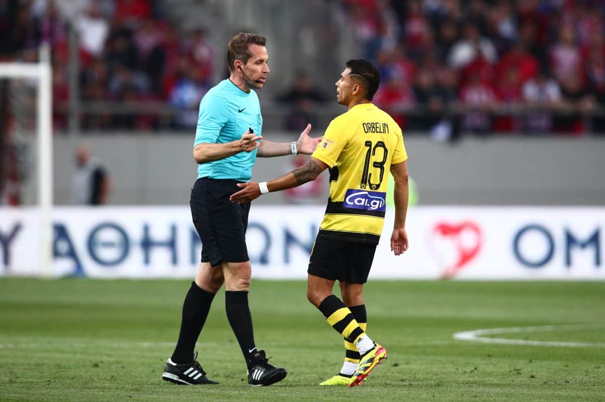 Ο Γερμανός ρέφερι πήρε αυτή την απόφαση βλέποντας τις έντονες διαμαρτυρίες από τον πάγκο των φιλοξενούμενων, θέλοντας να κατευνάσει την κατάσταση. Στον διάλογο που ακολούθησε, ο Αλμέιδα εξέφρασε παράπονα για τα εύκολα φάουλ υπέρ του Ολυμπιακού, ενώ ο Στίλερ απάντησε πως μπορεί να έχει κάνει λάθη, αλλά ζήτησε σεβασμό κατά τη διάρκεια του αγώνα.