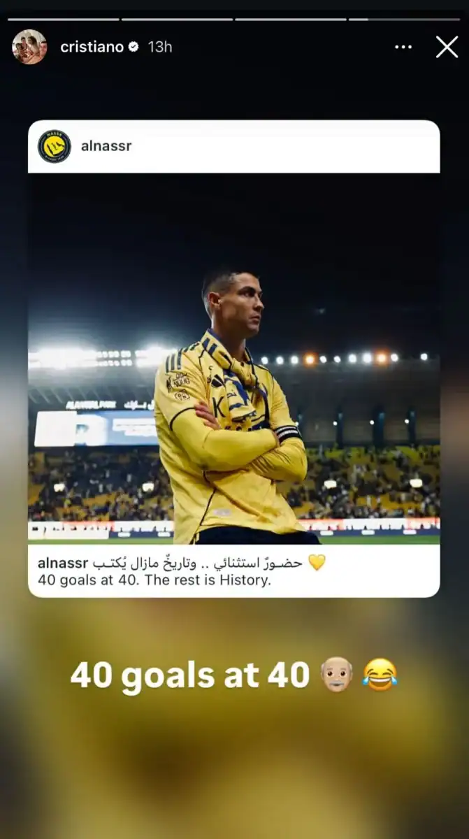 Μετά το τέλος του αγώνα, ο Ρονάλντο ανέβασε μια φωτογραφία από τον πανηγυρισμό του στα μέσα κοινωνικής δικτύωσης, συνοδεύοντάς τη με χιουμοριστική λεζάντα: «40 γκολ στα 40».