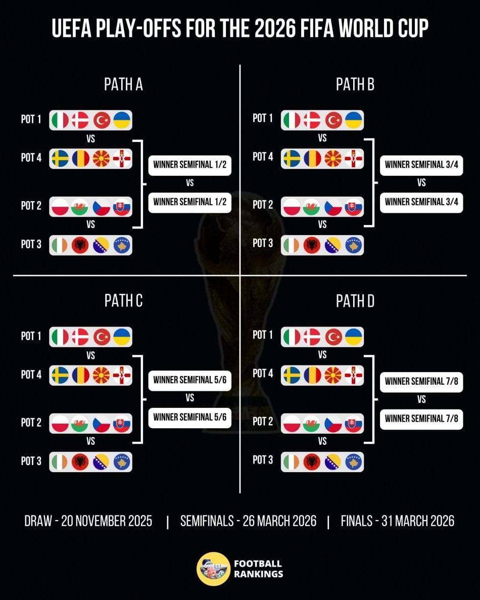 Οι 16 ευρωπαϊκές ομάδες που θα πάρουν μέρος στα playoffs για το Μουντιάλ 2026 περιμένουν να μάθουν το πρόγραμμα που θα τους δείξει τον δρόμο προς τα τέσσερα τελευταία εισιτήρια για την τελική φάση.