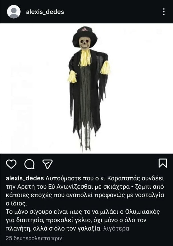 Αναλυτικά ανέφερε η ανάρτηση του: «Λυπούμαστε που ο κ. Καραπαπάς συνδέει την αρετή του Ευ Αγωνίζεσθαι με σκιάχτρα-ζόμπι από κάποιες εποχές που αναπολεί προφανώς με νοσταλγία ο ίδιος. Το μόνο σίγουρο είναι πως το να μιλάει ο Ολυμπιακός για διαιτησία προκαλεί γέλιο, όχι μόνο σ’ όλο τον πλανήτη, αλλά σ’ όλο τον γαλαξία».