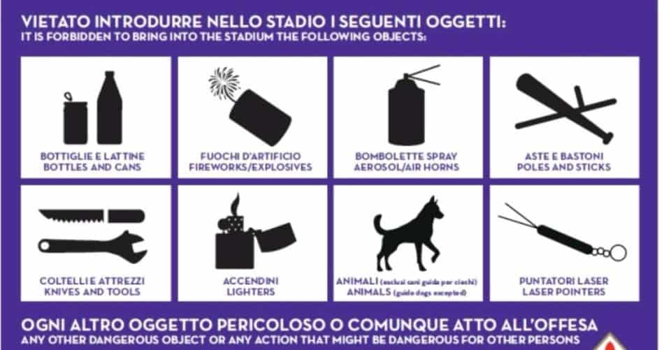 Η είσοδος στο γήπεδο με τσάντα μεγαλύτερη από μέγεθος χαρτιού Α4 θα απαγορεύεται, όπως επίσης και η είσοδος με κάποιο από τα απαγορευμένα αντικείμενα που αποτυπώνονται στη φωτογραφία: