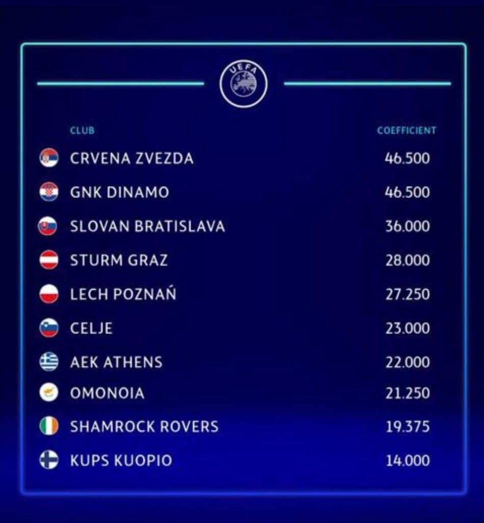 ▶️ Με τα τωρινά δεδομένα αυτή η ομάδα θα ήταν ο Ερυθρός Αστέρας και οι πέντε ομάδες με τον υψηλότερο συντελεστή θα ήταν οι Ντινάμο Ζάγκρεμπ, Σλόβαν Μπρατισλάβας, Στουρμ Γκρατς, Λεχ Πόζναν και Τσέλιε! Με νίκη ή και ισοπαλία απόψε η ΑΕΚ μπαίνει στην προνομιούχο τετράδα αντί της σχεδόν βέβαιης πρωταθλήτριας Σλοβενίας
