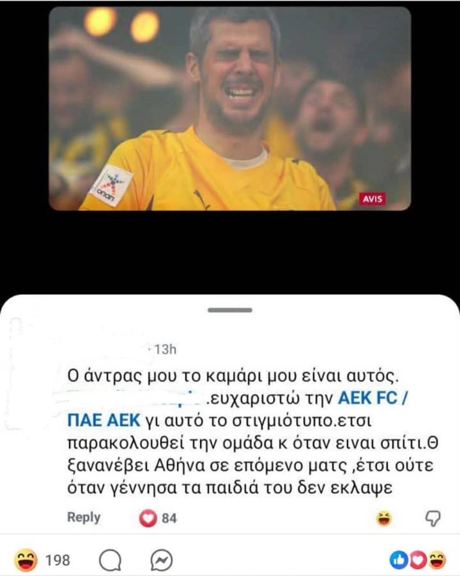 Η στιγμή αυτή απέκτησε ακόμη μεγαλύτερη αξία μέσα από τα λόγια της συζύγου του, η οποία τον αναγνώρισε στο βίντεο και έγραψε: «Ο άντρας μου το καμάρι μου είναι αυτός. ευχαριστώ την ΑΕΚ FC / ΠΑΕ ΑΕΚ γι αυτό το στιγμιότυπο έτσι παρακολουθεί την ομάδα κ όταν είναι στο σπίτι.Θα ξαναβεί Αθήνα σε επόμενο ματς ,έτσι ούτε όταν γέννησα τα παιδιά του δεν έκλαψε».