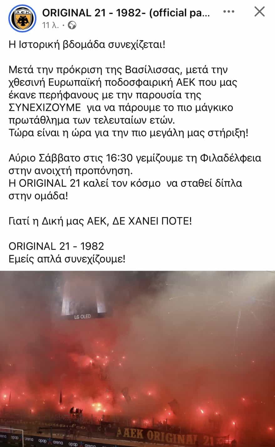 Η Original 21 καλεί ξανά τον κόσμο της ΑΕΚ σε δυναμική παρουσία στην ανοιχτή προπόνηση, παραμονή του μεγάλου ντέρμπι με τον ΠΑΟΚ στη Νέα Φιλαδέλφεια.